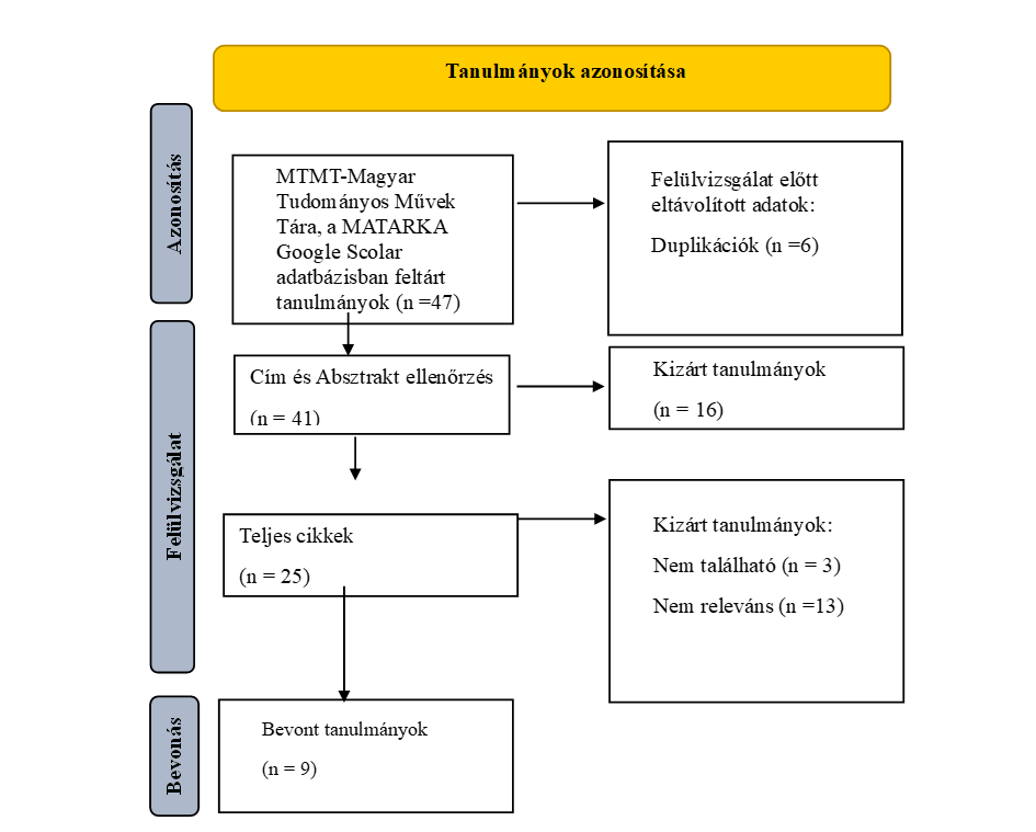 A keresések során azonosított rekordok közül első lépésben eltávolítottuk a duplikált és a tematikailag nem releváns publikációkat. Ezt követően többlépcsős szűrési eljárást alkalmaztunk. Az első szakaszban a címek és absztraktok alapján történt az előszűrés, amely során a tanulmányokat egymástól függetlenül értékeltük. Azok a publikációk, amelyek tartalmilag illeszkedtek a vizsgálat fókuszához, további elemzésre kerültek. Az absztraktok áttekintését követően döntöttünk a teljes szövegű feldolgozásról. A keresések összesen 47 rekordot eredményeztek, amelyek közül a szűrési folyamat végén 9 tanulmány felelt meg a beválogatási kritériumoknak, és került be a végső elemzésbe.