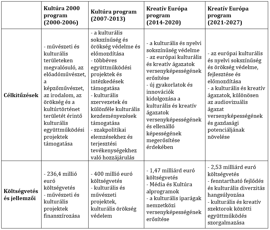 1. táblázat: Összegző táblázat a Kreatív Európa eddigi programjairól, célkitűzéseiket és költségvetési jellemzőiket ismertetve