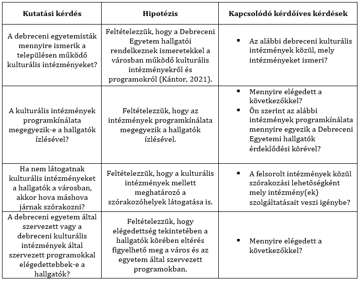 Előzetesen áttekintettük a releváns szakirodalmakat és korábbi empirikus kutatásokat, továbbá összevetettük a debreceni kulturális intézmények programkínálatát saját tapasztalatainkkal. Ezt kiegészítette az intézmények honlapjainak és közösségi felületeinek elemzése, valamint ismerőseink és barátaink tapasztalatainak összegyűjtése. Az így szerzett információk elemei szerepet játszottak a kérdőív végső struktúrájának kialakításában. A mérőeszköz összeállításakor részben korábbi kutatások kérdőíveit adaptáltuk (Pavluska et al., 2018; Márkus et al., 2024), ezzel is biztosítva az eredmények későbbi összehasonlíthatóságát.