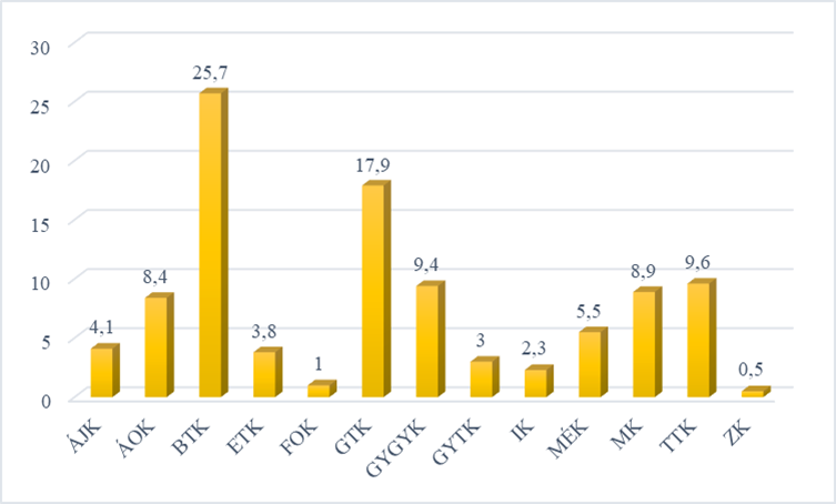 A kérdőív kidolgozásának egyik alapvető szempontja volt a válaszadók kari hovatartozásának meghatározása (2. ábra). A minta 25,7%-a (260 fő) a Bölcsészettudományi Kar hallgatója, 17,9%-a (181 fő) a Gazdaságtudományi Karon, míg 9,6%-a (97 fő) a Természettudományi és Technológiai Karon tanul.