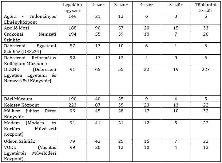 Felmértük, hogy az elmúlt egy évben hányszor látogatják az általunk felsorolt kulturális intézményeket (lásd 2. táblázat) A gyakorisághoz a következő lehetőségeket adtuk meg: egyszer sem, legalább 1-szer, 2-szer, 3-szor, 4-szer, 5-ször, több mint 5-ször. A DEENK, az egyetem könyvtára lett a leggyakrabban látogatott intézmény, 227 válaszadó az elmúlt egy évben több mint 5-ször járt itt. A könyvtárlátogatás legfőbb oka a kölcsönzés, azonban az elmúlt időszakban egy olyan színtérré nőtte ki magát, ahová a hallgatók tanulási célzattal csoportosulnak. A leggyakoribb eset, hogy egy évben legalább egyszer látogatnak kulturális intézményeket.