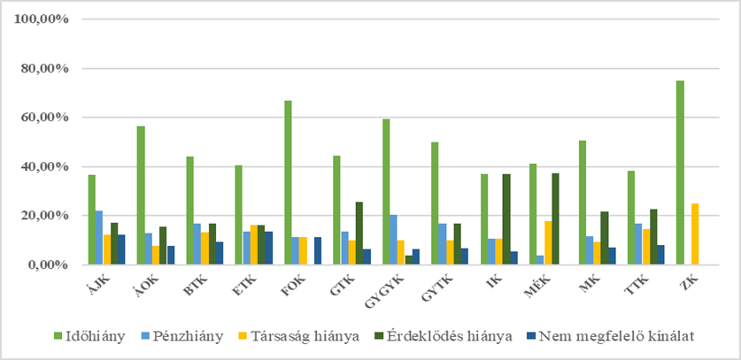 A hallgatókat arról is megkérdeztük, hogy mi az a legfőbb indok, ami miatt nem látogatják a helyi kulturális intézményeket gyakrabban. A 3. ábráról leolvasható, hogy ennek egyik legfőbb indok az időhiány. Ezen tényező a kitöltők arányához viszonyítva magas értéket mutat a Fogorvostudományi Kar (66,7%), Általános Orvostudományi Kar (56,4%) és Állam- és Jogtudományi Kar (36,6%) hallgatóinak körében. Ezt követi az érdeklődés hiánya, amely a Mezőgazdaság-, Élelmiszertudományi és Környezetgazdálkodási Kar (37,3%) és a Informatikai Kar (36,6%) hallgatói körében a legjellemzőbb. A pénzhiány tényezője leginkább az Állam- és Jogtudományi Kar (22%) és Gyermeknevelési és Gyógypedagógiai Kar (20,3%) hallgatóinak tekintetében okoz problémát.
