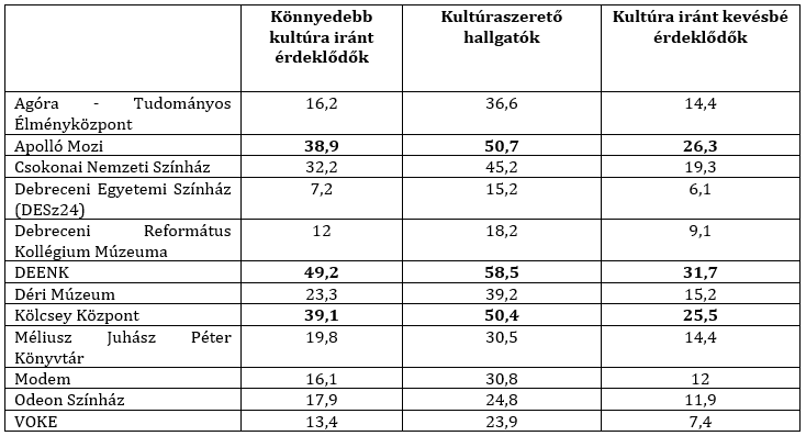 Egy kereszttáblás elemzés révén az egyes érdeklődési típusokhoz tartozó százalékok szemléltetik, hogy az adott klaszter tekintetében milyen mértékű a látogatottság a debreceni kulturális intézményekhez kapcsolódóan. Elmondható, hogy mindhárom érdeklődési típus esetében a legnagyobb látogatási százalékot az Apolló Mozi, a DEENK és Kölcsey Központ érte el (3. táblázat). Megfigyelhetjük, hogy a hallgatók nyitottan állnak a kulturális intézményekhez, a legtöbbről már hallottak, viszont nincs meg az a motiváció, ami miatt el is mennének ilyen helyekre. Az adott klaszternek megfelelően a nagyobb érdeklődés nagyobb látogatási gyakoriságot is mutat.