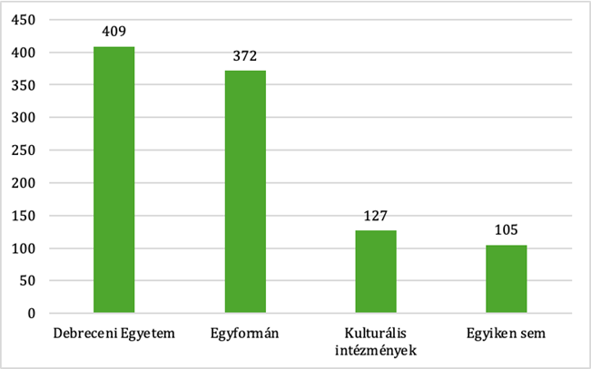 Felmértük, hogy a hallgatók a Debreceni Egyetem vagy a debreceni kulturális intézmények által szervezett programokra járnak el szívesebben: „Ön inkább a Debreceni Egyetem vagy a debreceni kulturális intézmények által szervezett rendezvényeken vesz részt szívesebben?” (4. ábra) A kérdésre négy válaszlehetőséget kínáltunk a hallgatóknak: a Debreceni Egyetemet vagy a helyi kulturális intézményeket látogatják szívesen, egyiket sem, vagy éppen ugyanolyan mértékben. Az adatok tekintetében megállapítható, hogy a kitöltőink 10%-a (105 fő) nem látogat szívesen ilyen eseményeket. A fennmaradó válaszok megoszlása pedig a következő: 409 hallgató (40%), jobban preferálja a Debreceni Egyetem által szervezett programokat, 372 egyetemista (37%) nem tesz különbséget a kulturális programok rendezői esetében. Egyformán látogatja a Debreceni Egyetem és a városban található kulturális intézmények programjait. Azon hallgatók, akik a kulturális intézmények által szervezett programokat látogatják inkább, összesen 127-en voltak (13%).
