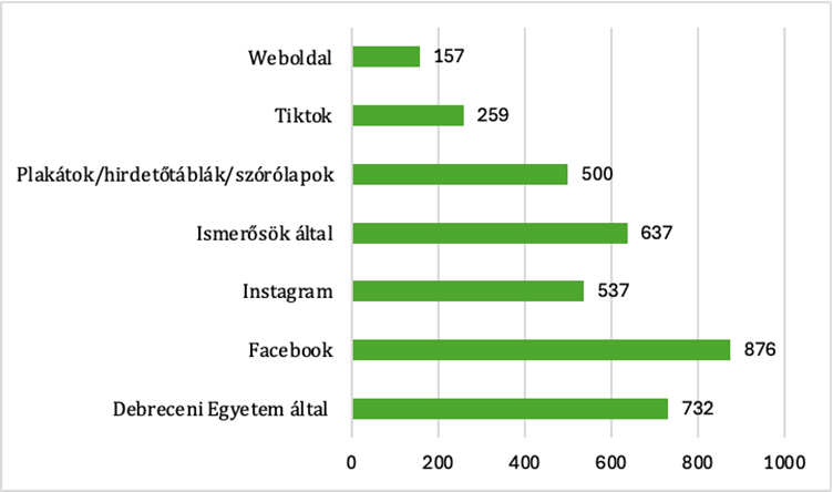 A válaszadók közül 732 fő a Debreceni Egyetem hivatalos csatornáit jelölte meg elsődleges tájékozódási formaként, míg 637 fő az ismerősök általi információszerzést preferálta. Ezt követően 537 fő az Instagramot, 500 fő a plakátokat, hirdetőtáblákat és szórólapokat, 259 fő a TikTok felületét, míg 157 fő a különböző weboldalakat választotta.
